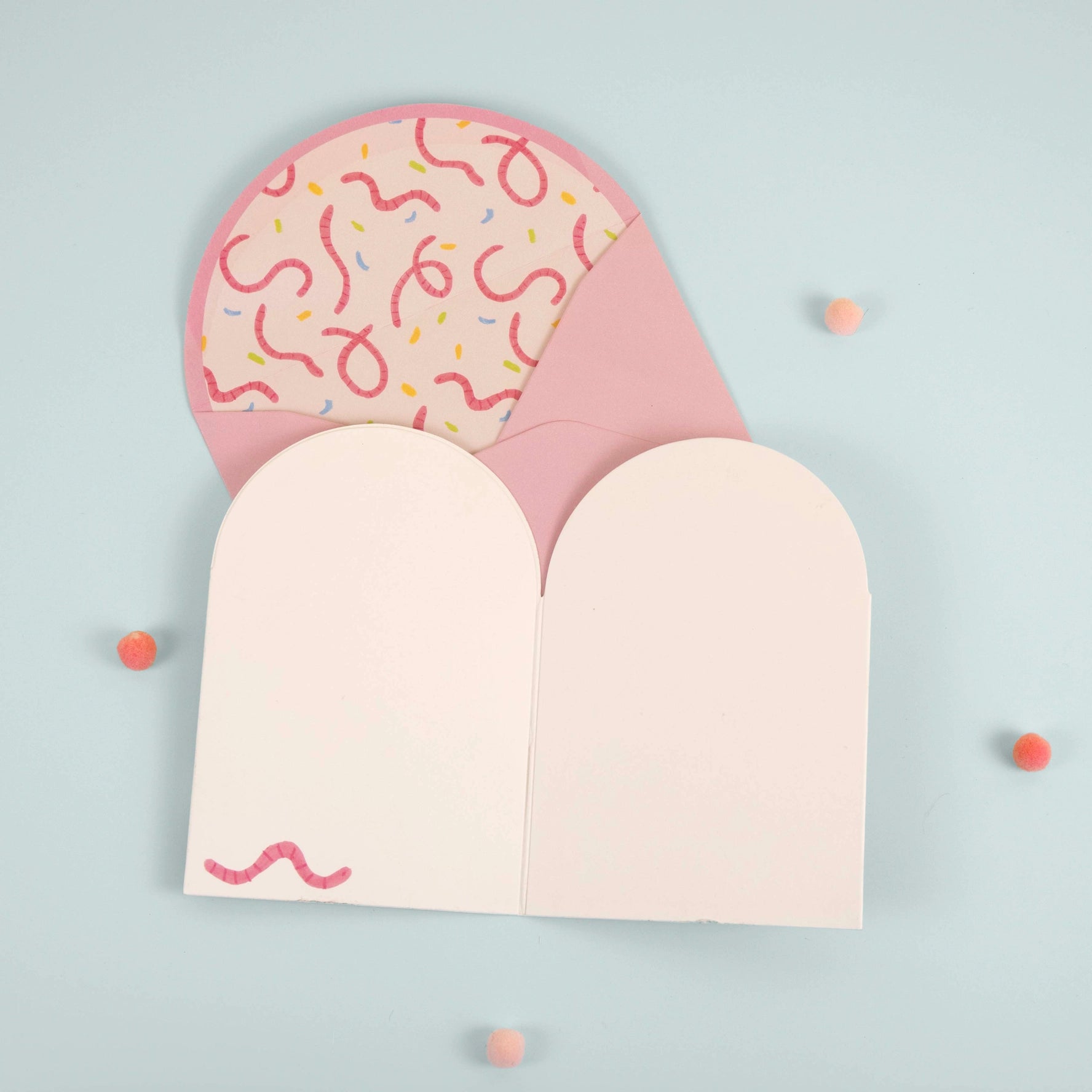 Pink envelope with printed interior of earthworms and confetti
