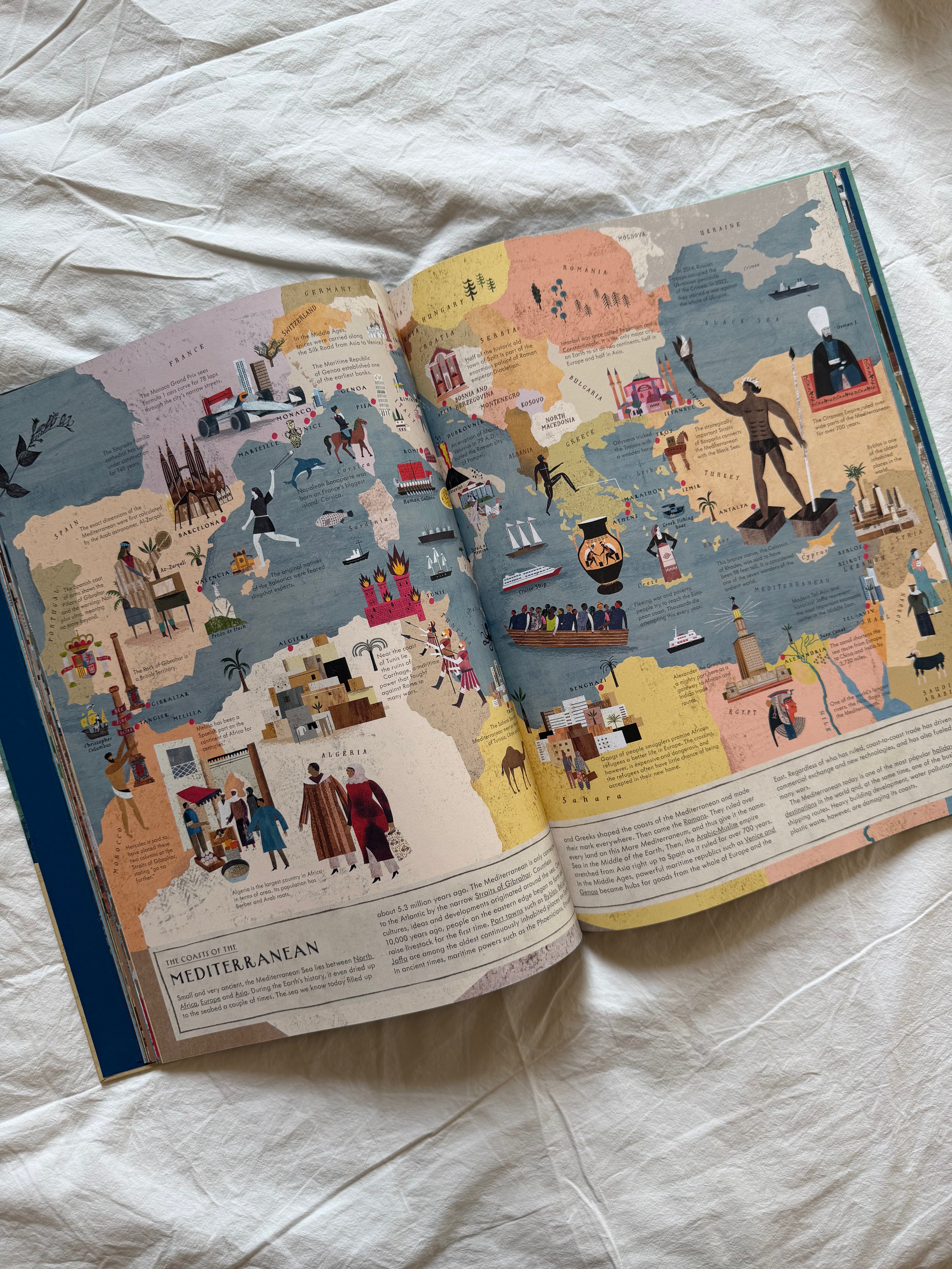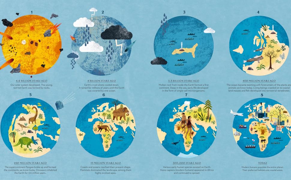 This trip around the world’s oceans provides hours of fun and learning in a series of highly detailed double-page spreads that look at every aspect of critical coastal habitats, including the ebb and flow of tides; life in a coastal settlement; artistic depictions of seashores; native animals and plants; the whaling industry; tourism; and climate change. The book also provides a Twenty-First-Century corrective to Western-centric narratives about exploration and colonialism. Interspersed throughout are meticulously detailed maps of the world’s largest oceans with historic events, figures and scientific facts highlighted.