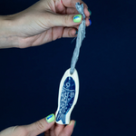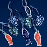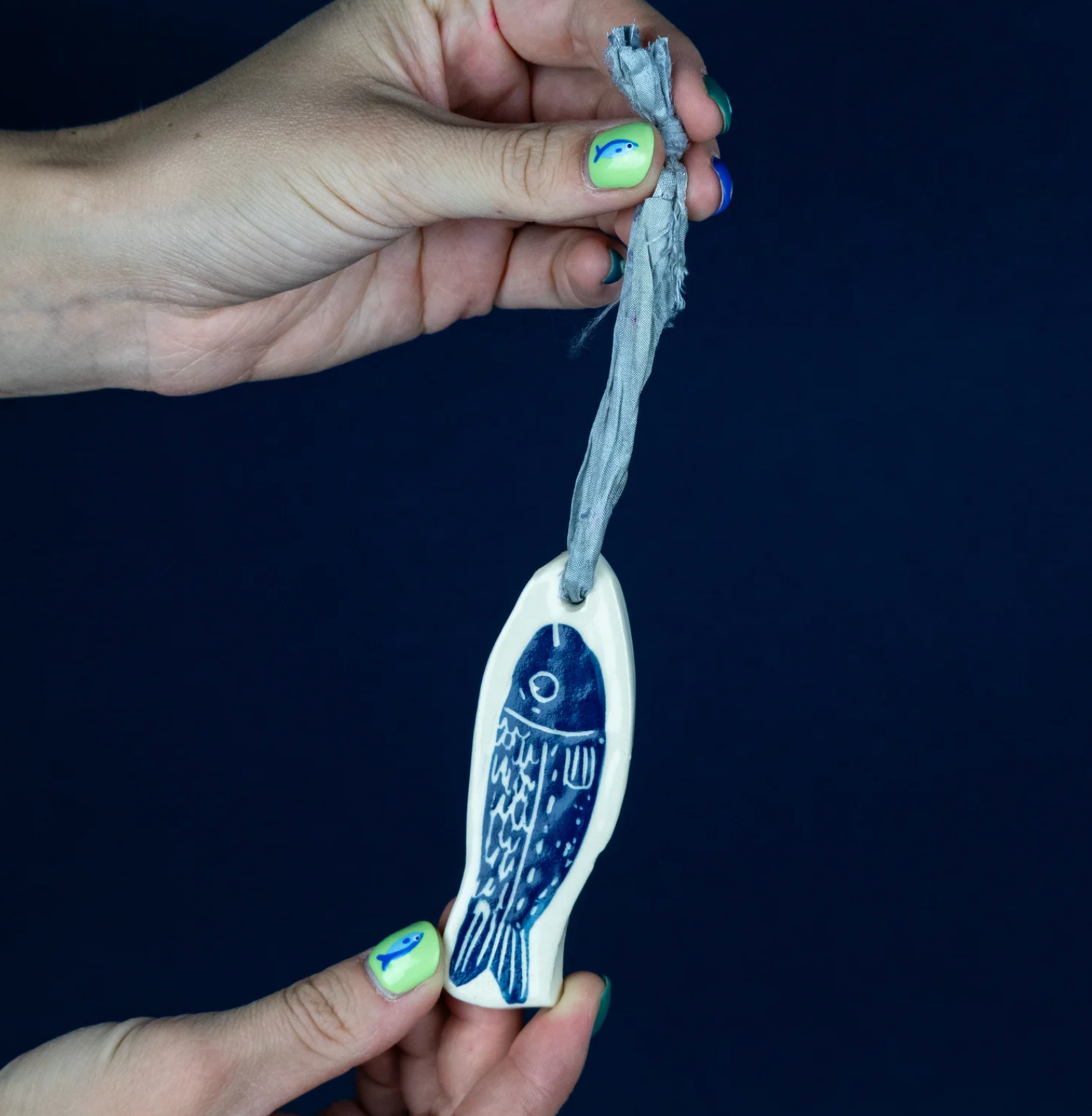 It's never too early to start collecting ornaments. Dive into whimsical decorating with these hand-formed and individually-painted ceramic fishy ornaments with a silk ribbon.