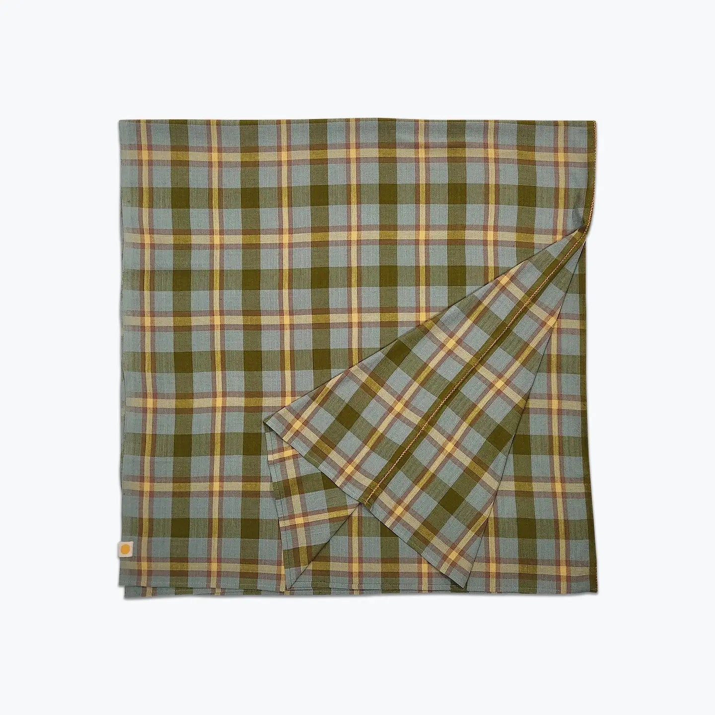 Plaid tablecloth in shades of green. Square 64” x 64”.