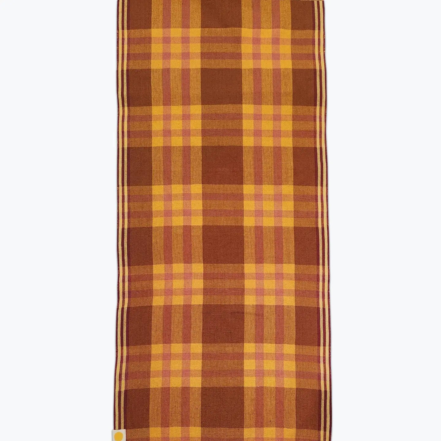 Plaid table runner in brown, ochre and pink. 16” x 90”