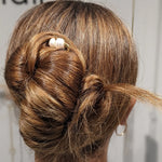 Our best selling pearl hair forks! Beautiful and functional brass forks are set with chunky pearls in grey for a minimal, modern look. Wear them in your hair or display as a pretty conversation piece.