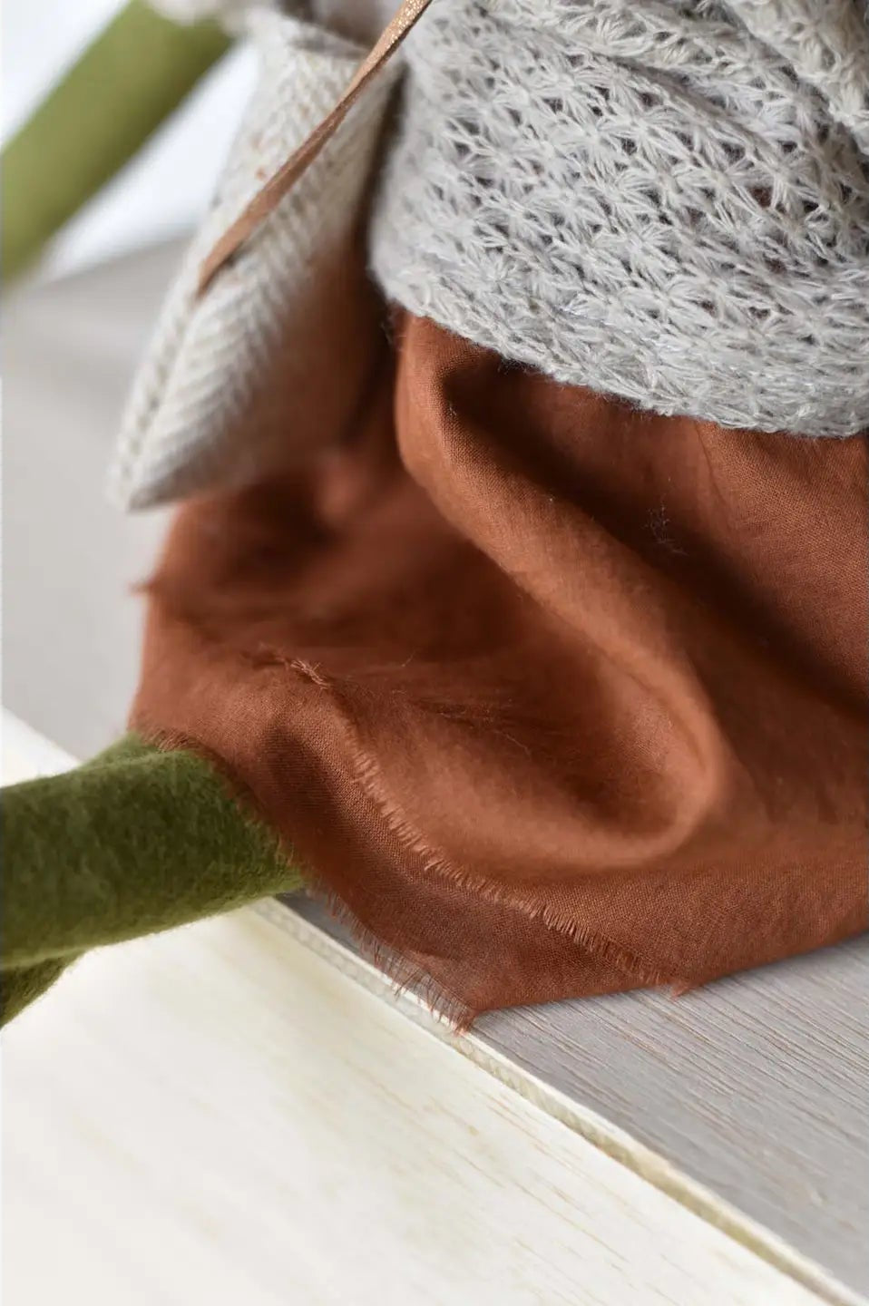 Fern is wearing her French Knit oatmeal sweater paired with a layered skirt in rust. Fern is always collecting treasures which she keeps in her crossbody satchel.
