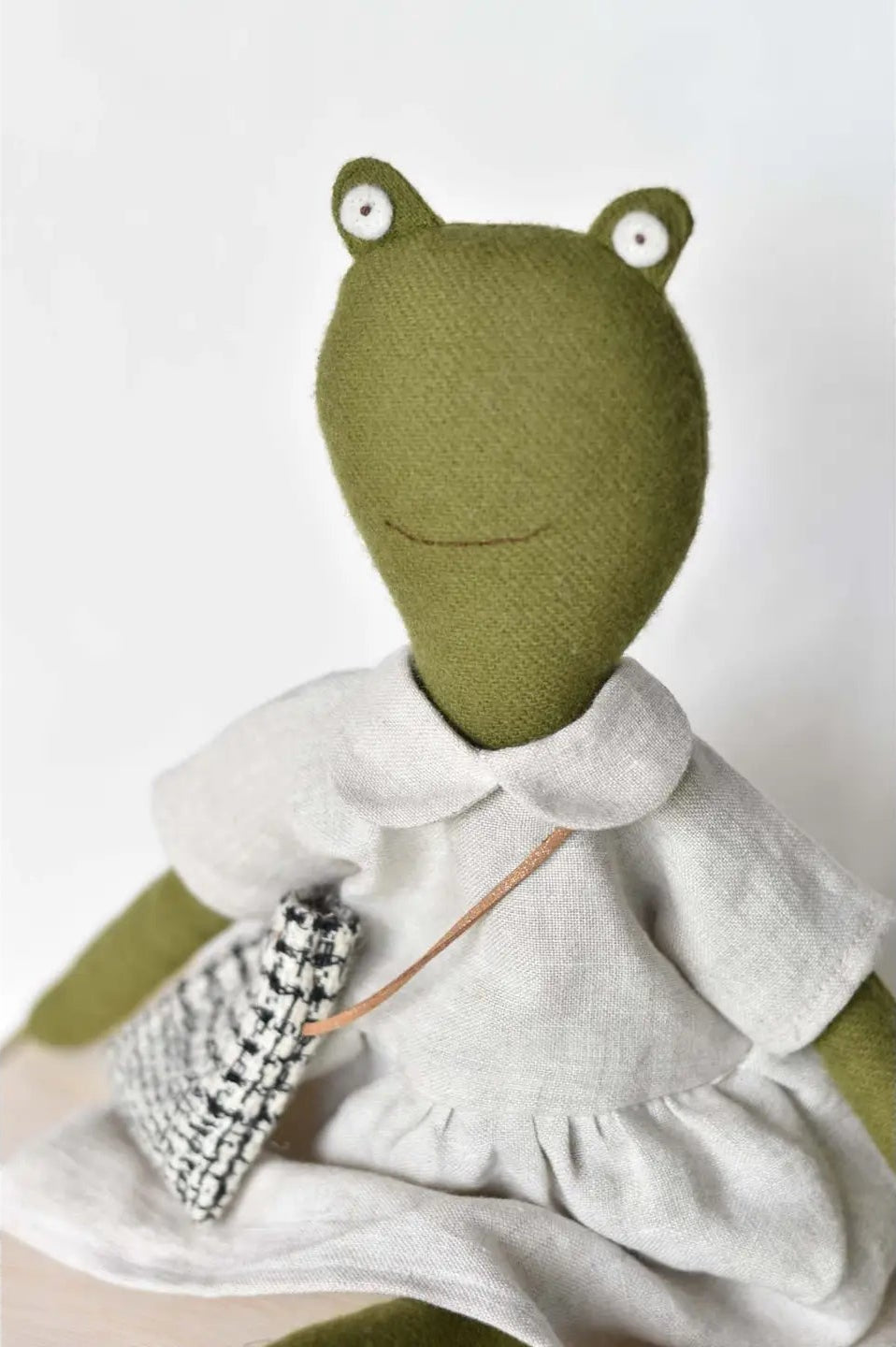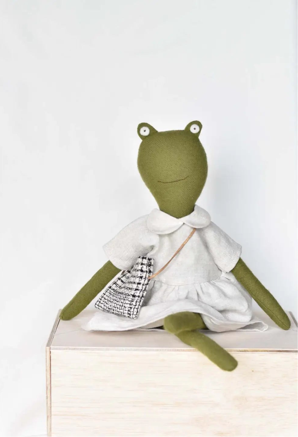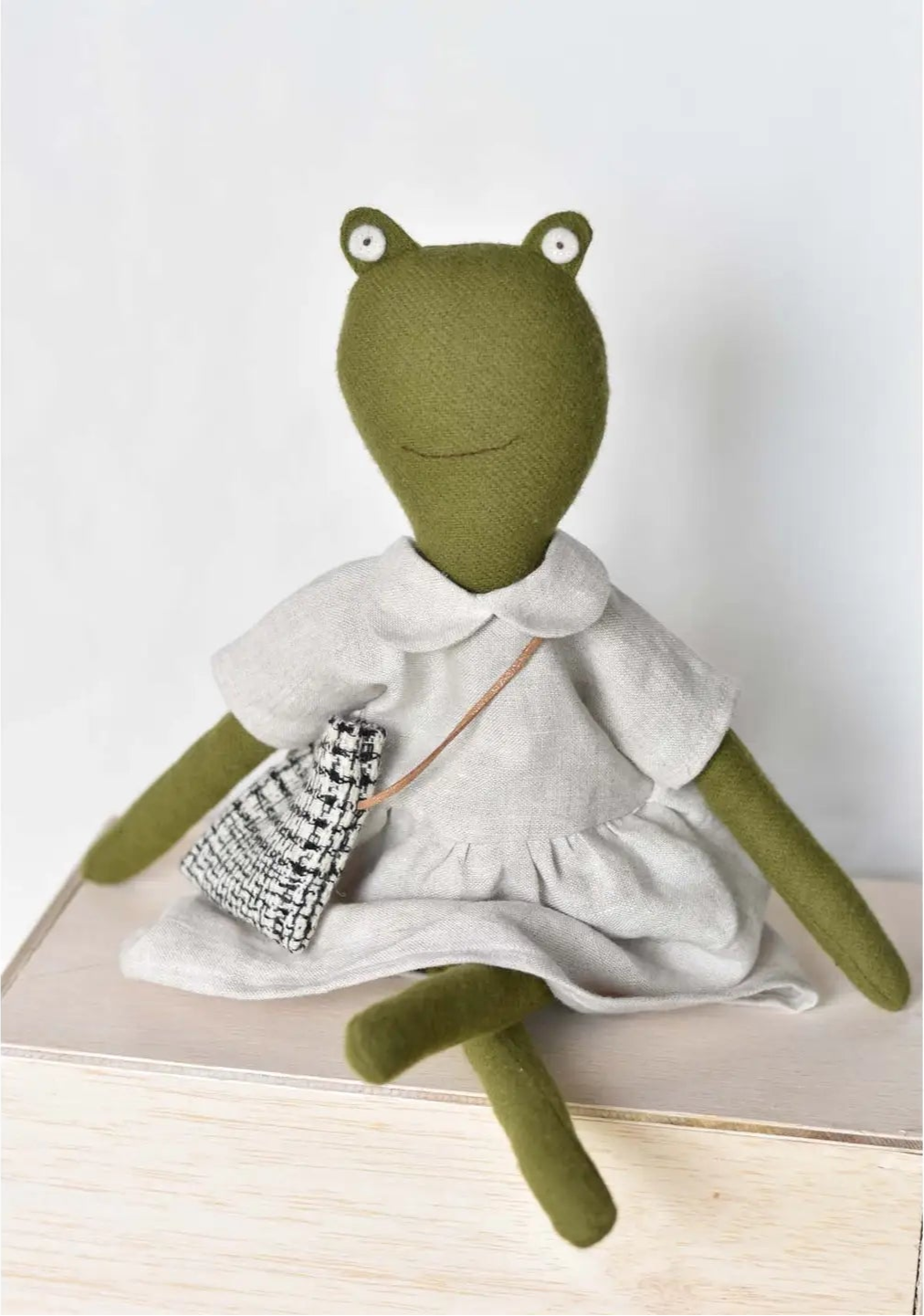 Fern is wearing a Linen Gather Dress in Natural Linen. Fern is always collecting treasures which she keeps in her crossbody wool tweed satchel.