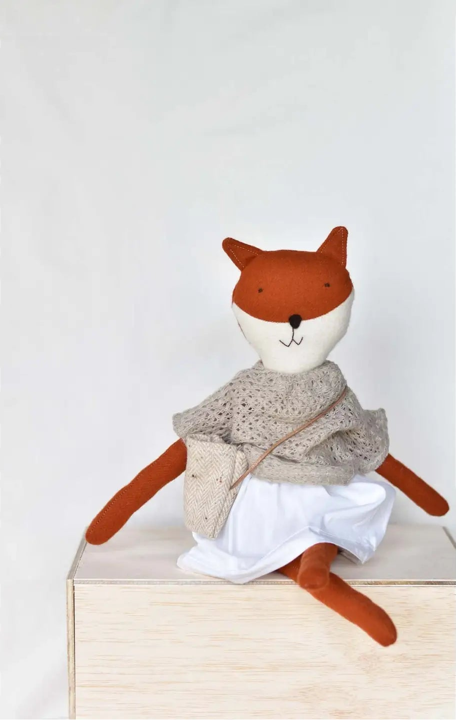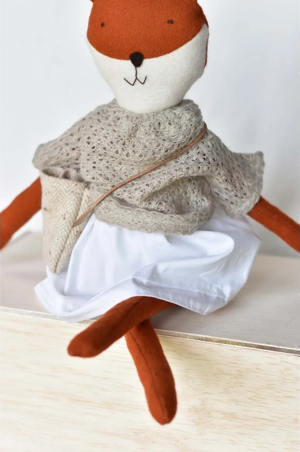 Meet Florette, a charming stuffed fox dressed in our French Knit sweater in oatmeal paired with a crisp cotton morning skirt. She carries a matching handmade woolen crossbody satchel, perfect for collecting treasures along the shoreline.