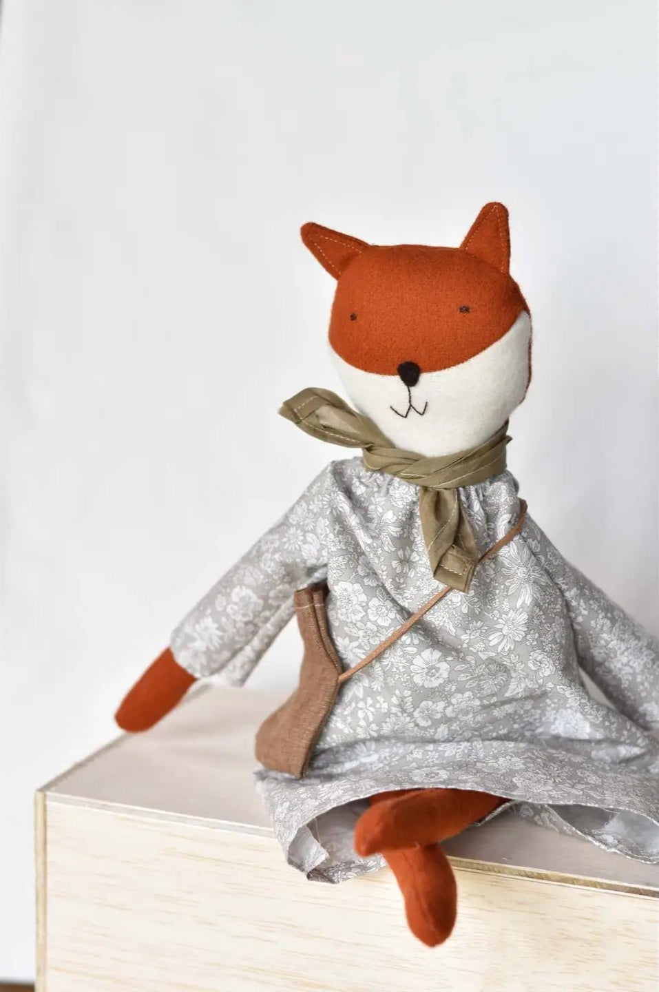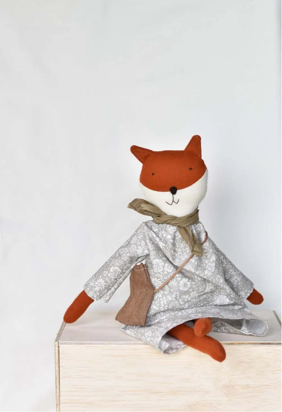 Meet Florette, a charming stuffed fox dressed in our Liberty Floral Day Dress in Oatmeal. She carries a matching handmade woolen crossbody satchel, perfect for collecting treasures along the shoreline.