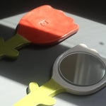Hand built hand-mirror in the shape of the cutest little flower ever. All hand mirrors are hand made which makes each one special and unique. All mirrors come with a hole, so that you may hang it if you'd like. Available in three colors, orangey-red, white, & light yellow.