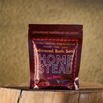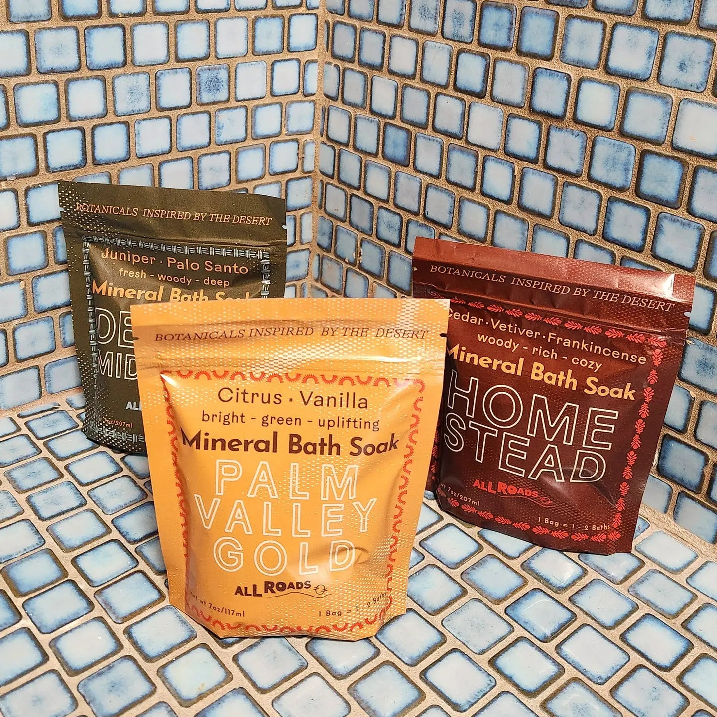 Inspired by the many abandoned wooden homestead shacks sprinkled across the Mojave Desert, the Homestead bath salts are scented with cedar, vetiver and frankincense. A woodsy scent with essential oils that are believed to have anti-inflammatory properties. 7 oz pouch of magnesium bath salts. Recommended use is 1 bag for 1 bath.