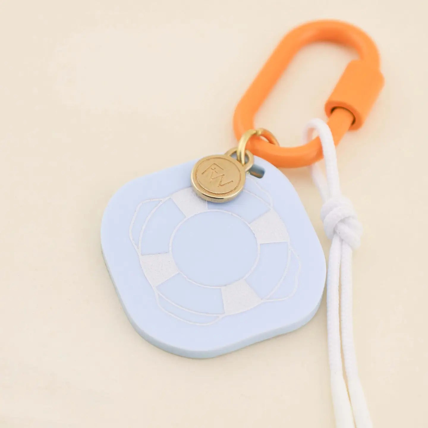 A classic symbol of all things nautical. Our Lifebuoy Bag Charm adds a clean, timeless touch to your beach bag or boat keys. Made to mix, match, and sail into summer. Perfect for boat days, coastal road trips, or yacht rock playlists. Details: light blue acrylic charm with white buoy design, orange carabiner, and + white cord.
