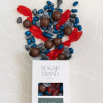 Take a bite of nostalgia with this cozy, coastal mix inspired by the sweet simplicity of summers in Maine. Smooth and creamy chocolate maple malt balls offer a rich, comforting crunch with a hint of real maple syrup. Juicy blueberry jelly beans burst with fruity flavor, reminiscent of wild berry picking along wooded trails. The shimmering rock chocolates bring a satisfying bite of milk chocolate inside candy-coated pebbles—like skipping stones by the lake. And for a whimsical touch, chewy lobster gummies add a soft, sweet finish to this charming tribute to Maine’s coastal magic.