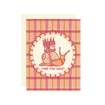 Set on a strawberry and orange sherbet plaid pattern, this snail card brings timely birthday tidings AND a sweet little treat strapped to its back with a gauzy bow.