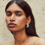 Our design team took inspiration from the traditional glazed Zellige tiles handcrafted in Morocco and created these hoops, our freshest new silhouette in gold-plated brass with bright amazonite stone inlay.